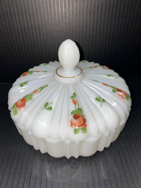 Title (ebay affiliate link): Vintage Westmoreland Hand Painted Milk Glass Round Candy Dish w/Lid 7"