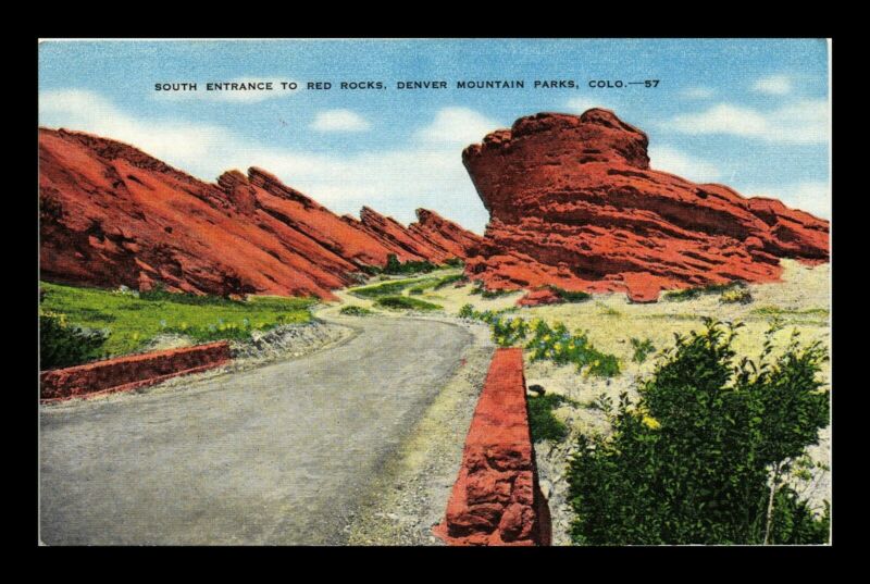 Title (ebay affiliate link): US LINEN POSTCARD SOUTH ENTRANCE TO RED ROCKS DENVER MOUNTAIN PARKS COLORADO