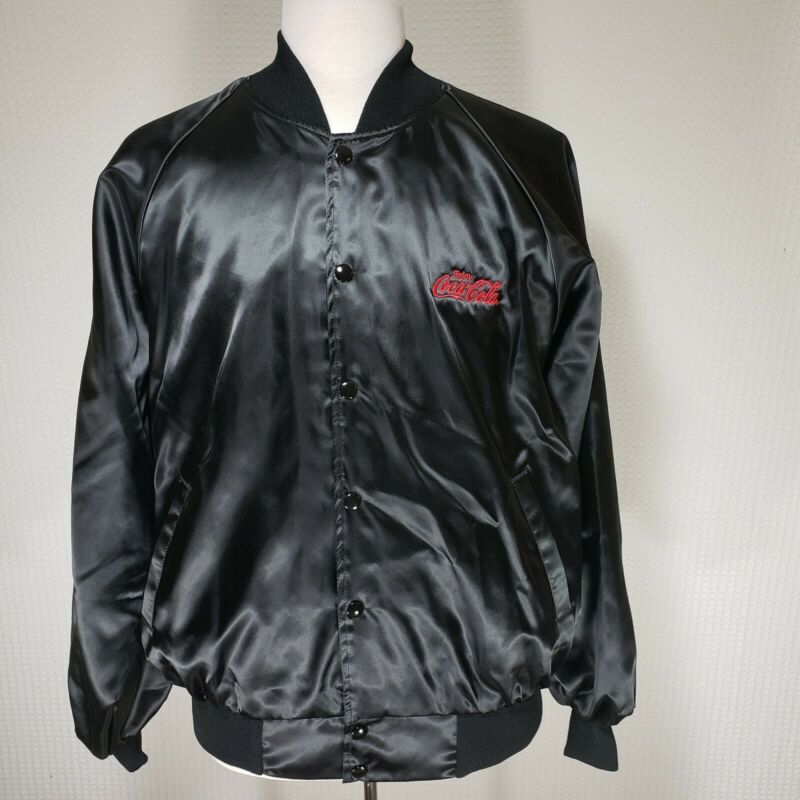 Title (ebay affiliate link): Vintage 1970s XL Coca Cola Black Satin Snap Button Lined Lightweight Jacket USA