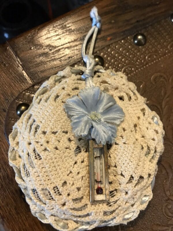 Title (ebay affiliate link): Old Crocheted Potpourri Pouch With Old Tiny Thermometer/Silk Flower