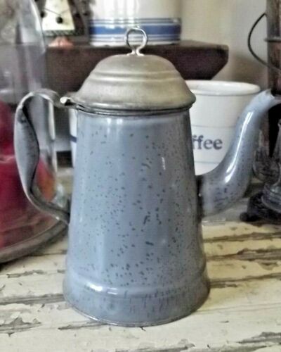Title (ebay affiliate link): Early Granite Ware Coffee Pot Goose Neck Spout Unique Tin Lid w/Wire Fob Top