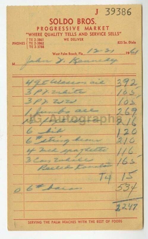 John F. Kennedy Original 1961 Receipt from Soldo Bros. Grocery Store