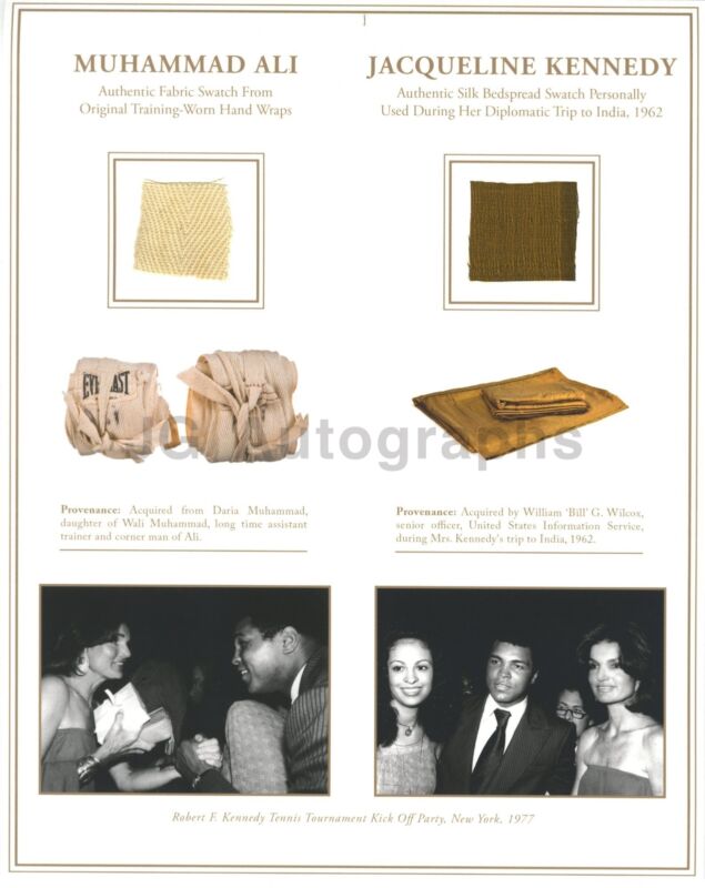 Title (ebay affiliate link): Muhammad Ali & Jacqueline Kennedy Dual Fabric Swatch Historical Relic Display