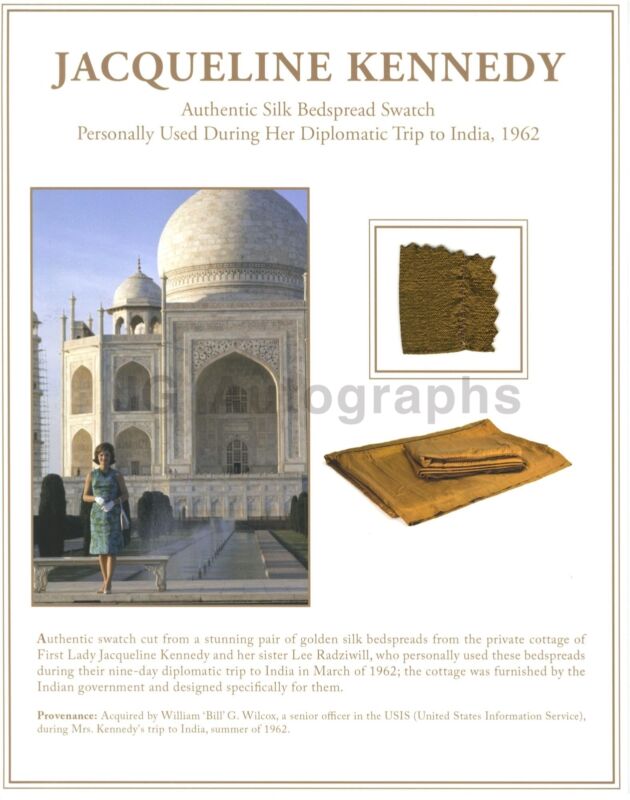 Title (ebay affiliate link): Jacqueline Kennedy Display w/ Silk Swatch From Diplomatic Trip to India, 1962
