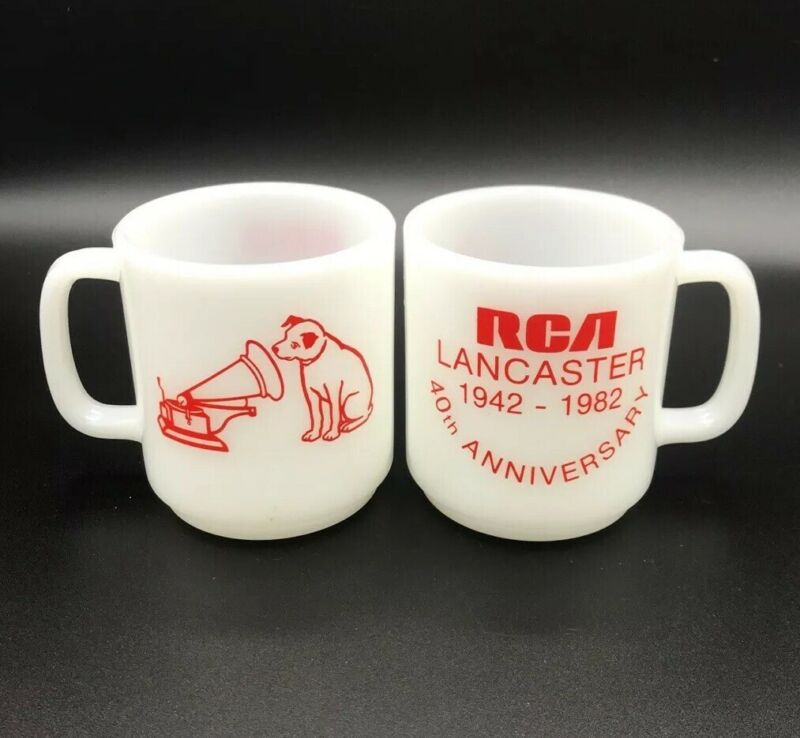Vtg Set (2) Glasbake Milk Glass RCA Nipper Dog Lancaster Anniversary Coffee Mugs
