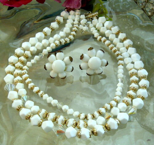 Title (ebay affiliate link): VINTAGE SIGNED JAPAN WHITE MILK GLASS BEAD 3 STRAND BIB NECKLACE EARRINGS LOT!!