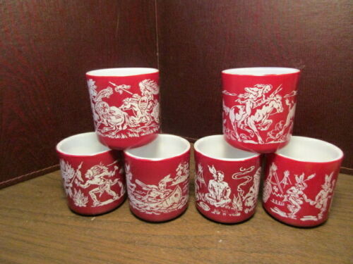 Set of 6 Vintage Hazel Atlas Child''s Indian Mugs Dark Burgundy - Milk Glass