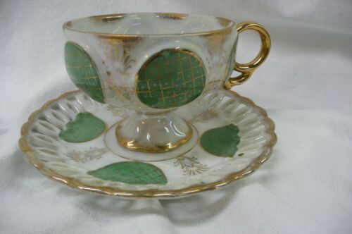 Vtg "JAPAN" TEA CUP SAUCER GREEN IRIDESCENT GOLD Gilt Fine Procelain