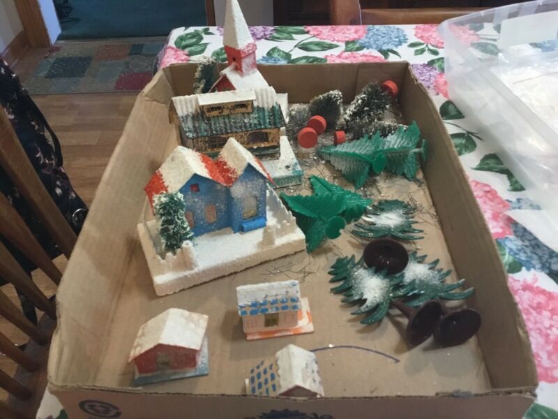 Title (ebay affiliate link): Vintage Paper Houses Christmas Trees Cardboard Church Train Village