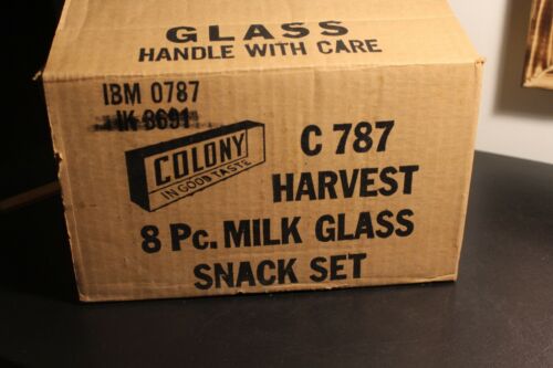 Title (ebay affiliate link): NOS Set of 4 Vintage Colony Harvest Milk Glass Snack Set Cup Plate