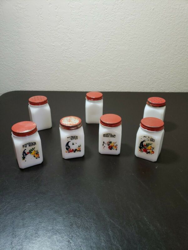 Title (ebay affiliate link): McKee Tipp City Cornucopia White Milk Glass Spice Shakers Set Of 7 Red Metal Lid