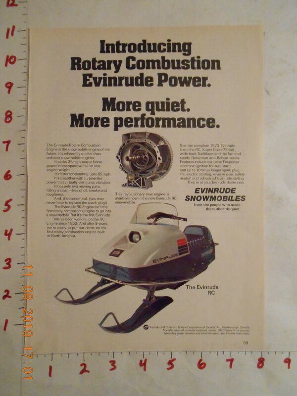 Title (ebay affiliate link): 1972 The Evinrude RC vintage snowmobile AD from Canada rotary combustion engine