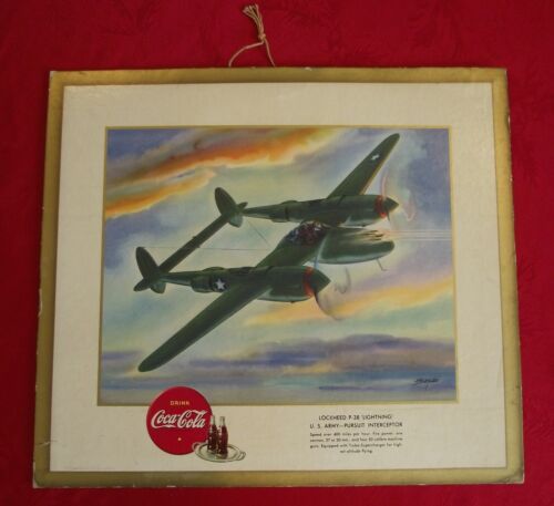 Title (ebay affiliate link): Vintage Coca Cola WW II Lockheed P-38 Lightning Airplane Sign 1943 Gas Oil Rare