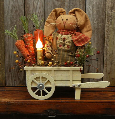 Title (ebay affiliate link): HANDMADE PRIMITIVE SPRING EASTER BUNNY RABBIT CARROTS CANDLE LAMP WHEELBARROW
