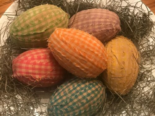 6 Large Primitive Coffee Gingham homespun Rag Fabric Easter Eggs farmhouse Decor
