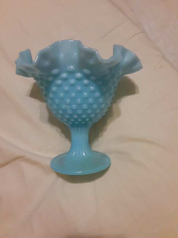 Title (ebay affiliate link): Fenton blue milk glass hobnail vase 6" high x 6.5" across.
