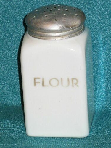 Title (ebay affiliate link): Vtg McKEE Depression White Milk GLASS RANGE SIZE BOX FLOUR SHAKER W/ LID
