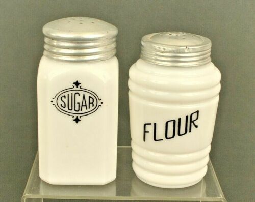 Title (ebay affiliate link): 2 Vintage Milk Glass Shakers - Sugar & Flour - Kitchen Collectible