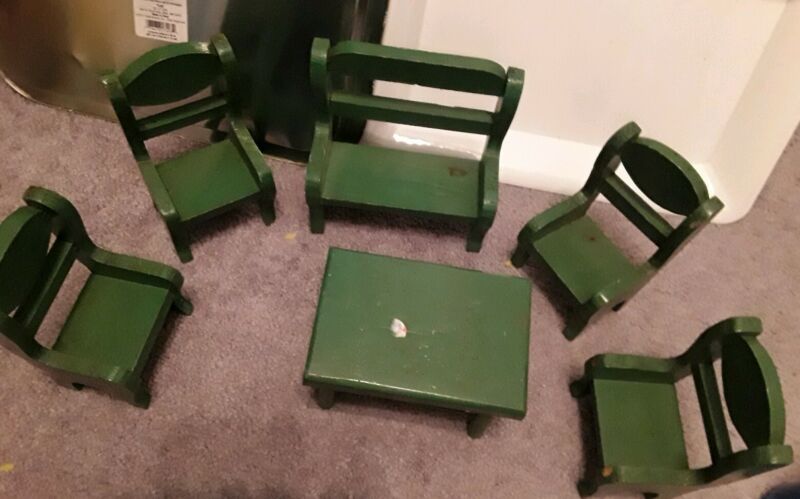 Title (ebay affiliate link): Vintage Painted Wood Doll House Furniture 4 chairs, 1 bench & coffee table GREEN