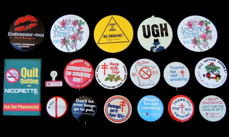 Title (ebay affiliate link): Anti-Smoking Cause Pinback Buttons & Tabs LOT of 18 pcs