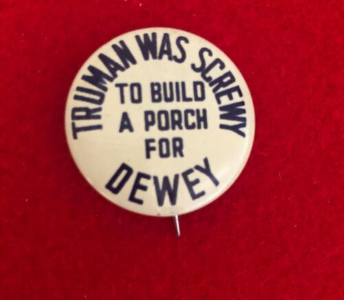 Title (ebay affiliate link): Vintage political pinback: ''Truman was Screwy to Build a Porch for Dewey''