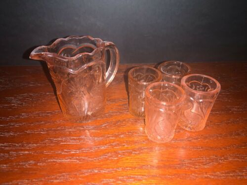 Title (ebay affiliate link): Mini Pink Depression Glass, Pitcher and glasses, birds