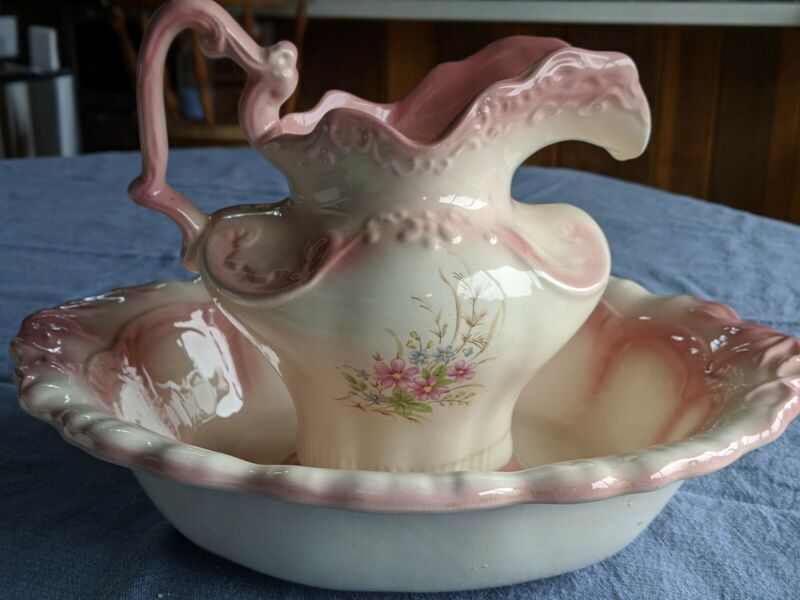Title (ebay affiliate link): Antique pitcher and wash basin Rose pink ceramic farmhouse pitcher and bowl