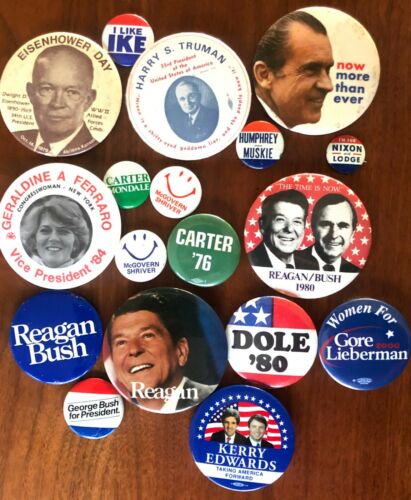 Title (ebay affiliate link): 18 Campaign Pins Truman Eisenhower Nixon McGovern Carter Ferraro Reagan Bush