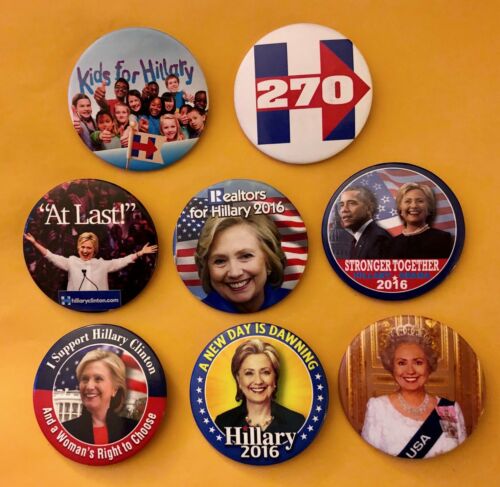 Title (ebay affiliate link): Eight 2 1/4" Hillary Clinton Presidential Political Campaign Pins