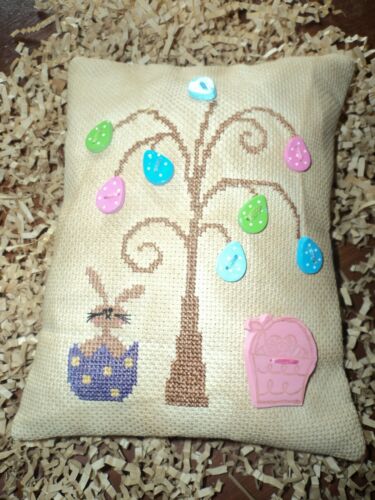 Title (ebay affiliate link): Finished Cross Stitch Bent Creek Easter Tree Ornament Pillow Bunny Basket button