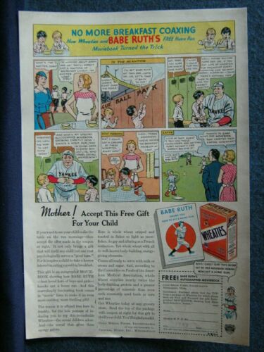 Title (ebay affiliate link): 1933 Babe Ruth Wheaties Comic Style Ad - Offers MOVIEBOOK on How To Hit Homers