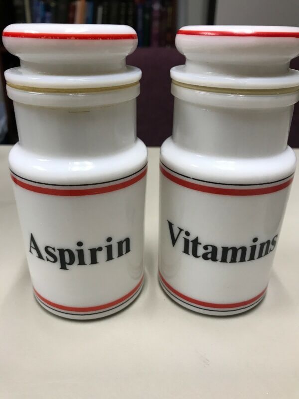 Title (ebay affiliate link): 2 Vintage Milk Glass Apothecary Jar Pharmacy Bottles Vitamins & Asprin Canister