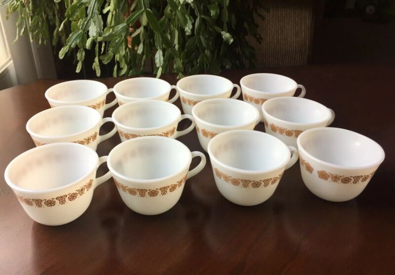 Title (ebay affiliate link): Lot of 12 Vintage Pyrex Butterfly Gold Round C Handle Milk Glass Cup/Mugs 8oz.