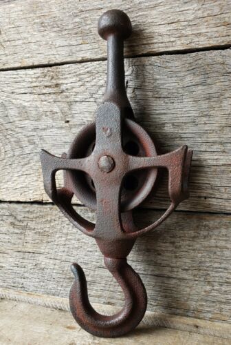 Title (ebay affiliate link): Antique Cast Iron Pulley Drop Pulley Hay Trolley Block Tackle Farm Barn Salvage