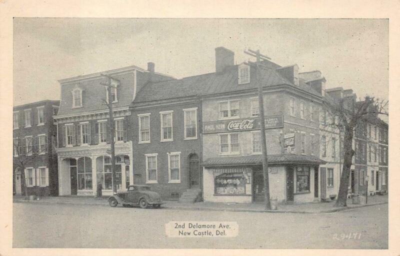 2ND DELAMORE AVE NEW CASTLE DELAWARE COCA-COLA SIGN POSTCARD (c. 1940s)
