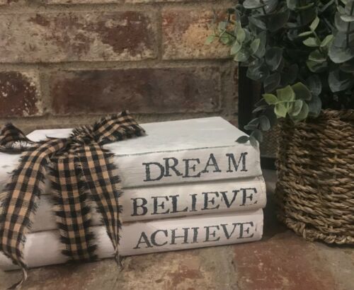 Title (ebay affiliate link): Primitive Vintage Painted Stamped Farmhouse Books Decor DREAM BELIEVE ACHIEVE