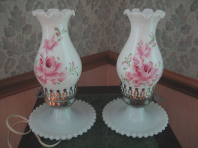 2 VINTAGE ESTATE MILKGLASS LAMPS W/ HAND PAINTED SHADES