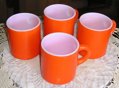 Set 4 Vtg. ORANGE milk glass Mugs - Orange Peel Texture