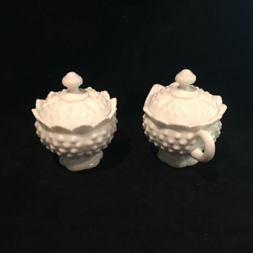 Fenton USA White Hobnail Milk Glass Scalloped Sugar Bowl & Creamer