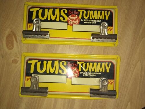 2 Vintage Tums for the Tummy Metal Advertising Signs / Clips