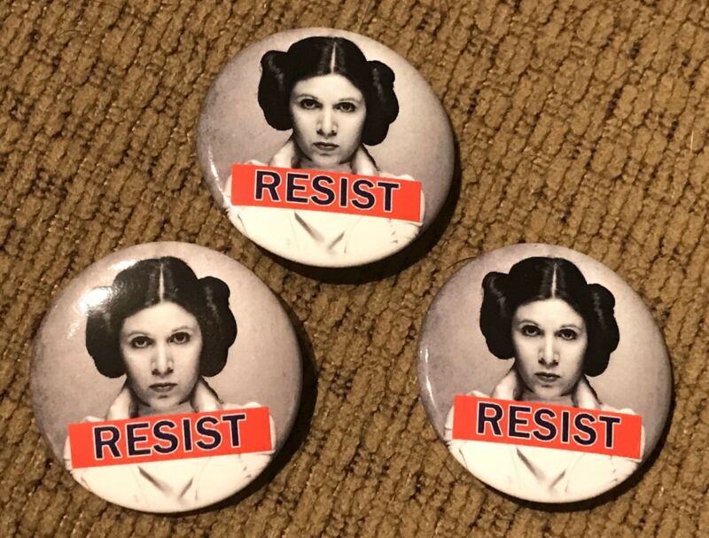 Title (ebay affiliate link): 3 Princess Leia Star Wars Anti Trump RESIST 2020 Carrie Fisher Button Pin Lot