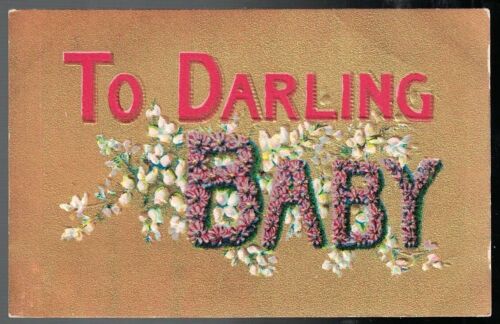 ANTIQUE 1910 EMBOSSED FLOWER LETTERS GREETINGS TO DARLING BABY POSTCARD