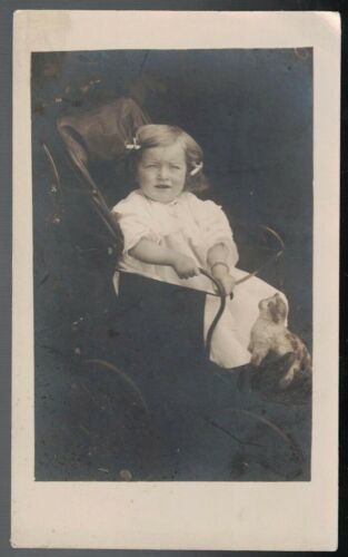 Title (ebay affiliate link): ANTIQUE 1910 RPPC REAL PHOTO LITTLE GIRL IN STROLLER WITH STUFFED ANIMAL