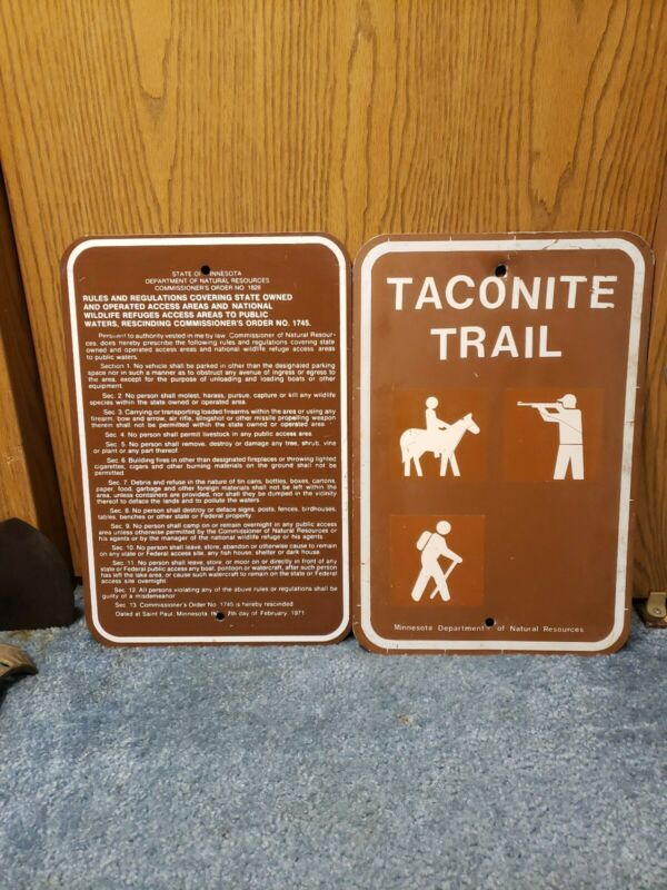 Title (ebay affiliate link): 2 Rare Vintage Minnesota Taconite Trail DNR Metal Signs Old Hunting Hiking Trail