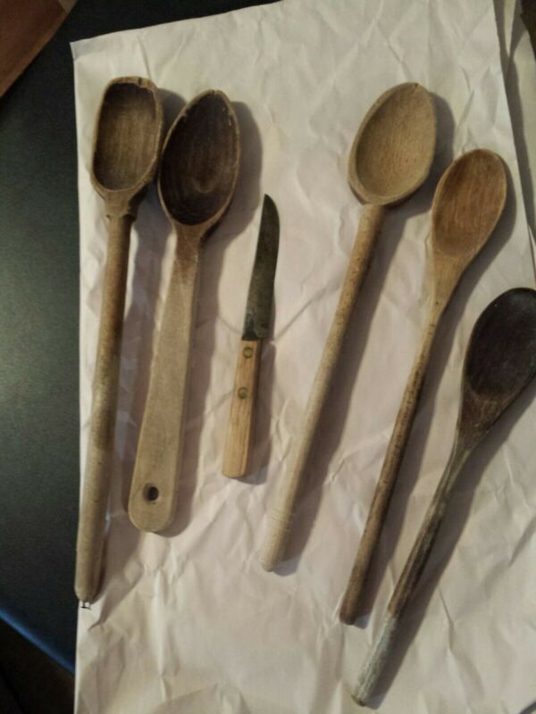 Title (ebay affiliate link): 5 ANTIQUE VINTAGE PRIMITIVE OLD FARMHOUSE WOOD SPOONS 1 Old Hickory knife