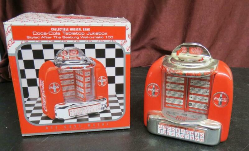 Title (ebay affiliate link): Coca-Cola Tabletop Jukebox Collectible Musical Bank Die-Cast Metal 1996