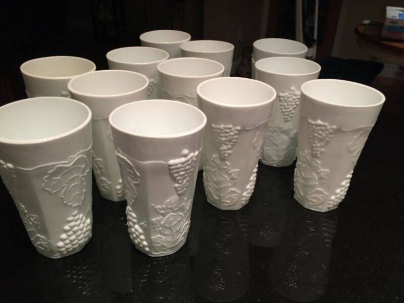 Title (ebay affiliate link): VINTAGE SET OF 12 WHITE MILK GLASS TUMBLERS, RAISED GRAPE & VINES, 12oz, Perfect