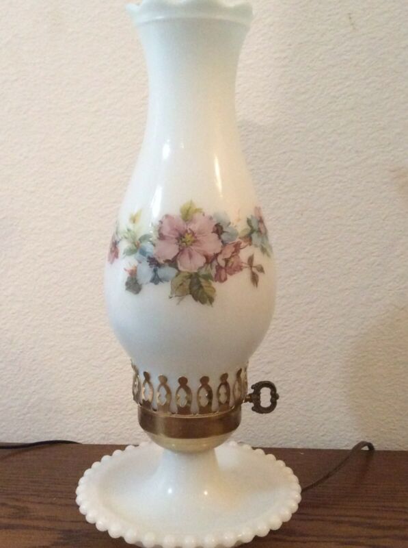 Vintage Pretty 13 milk glass hurricane Boudior Table lamp Purple floral accents
