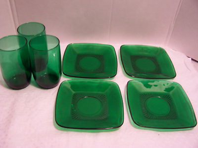 Title (ebay affiliate link): 4 Forest Green Depression Plates and 3 Glasses