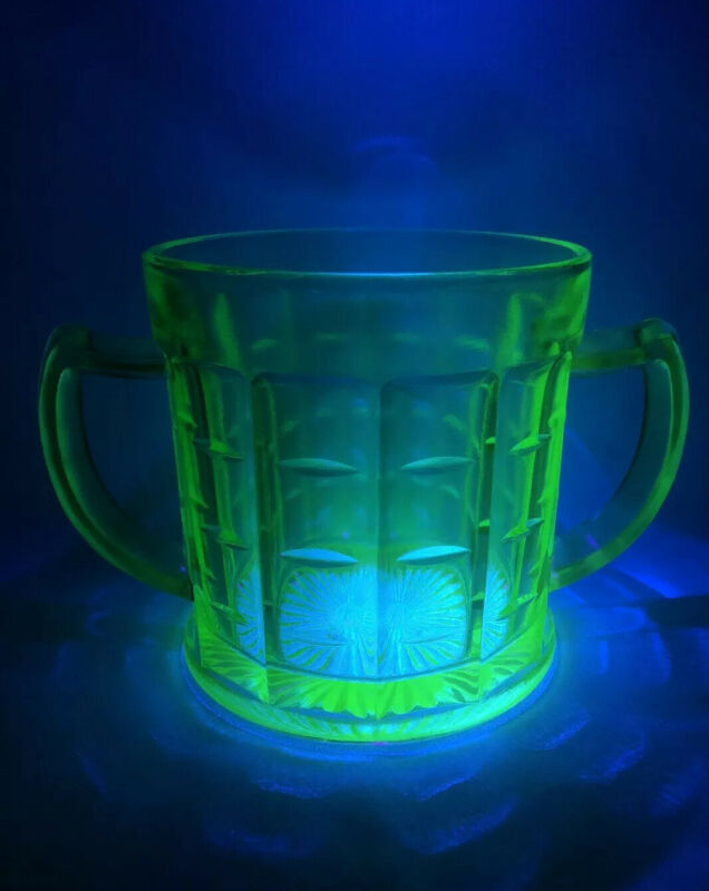 Title (ebay affiliate link): VINTAGE GREEN DEPRESSION GLASS SQUARES DOUBLE HANDLE SUGAR BOWL NO LID GLOW